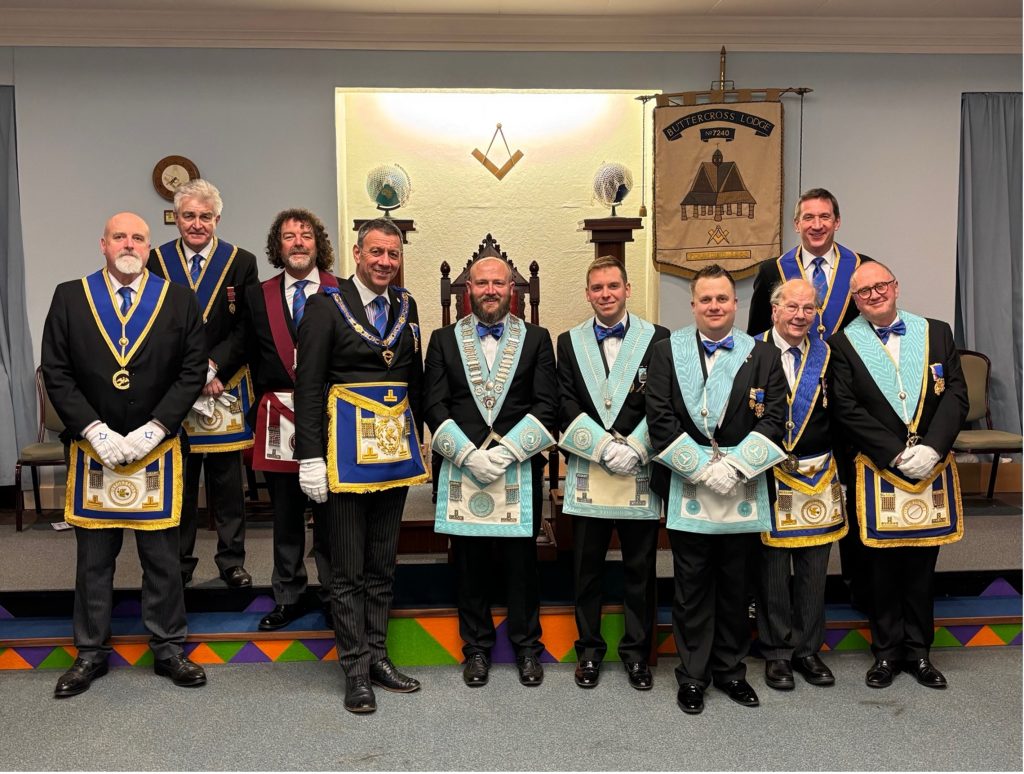Puctured: APrGM WBro Bernd Wegerhoff PJGD (3rd from Right) and New WM WBro Kevin Tomes PPrGSuptWks (3rd from Left) with the installing master, Provincial visitors and new wardens.  St Edburg’s Lodges No. 9233 held its installation meeting on Friday 19th September 2025 at the Weyland Hall, North Street, Bicester. The